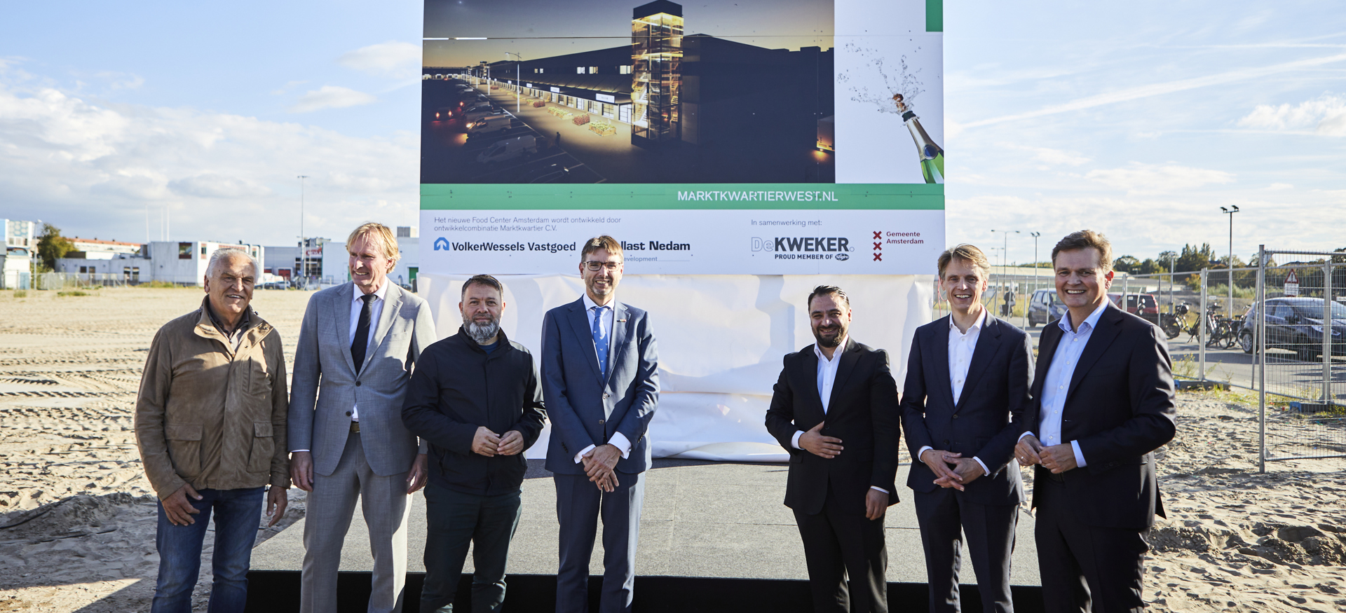 Construction has begun on the first 25,000 m² of new commercial space at Food Center Amsterdam. Alderman Steven van Weyenberg (Land and Development) of the Municipality of Amsterdam gave the official start signal, together with the entrepreneurs who will move into the new commercial spaces and the management of the developers united in Marktkwartier: Ballast Nedam Development and VolkerWessels Vastgoed. Ultimately, the new Food Center Amsterdam will provide space for 95,000 m² of commercial premises. In addition, 1,700 rental and owner-occupied homes and a wide range of amenities will be developed.