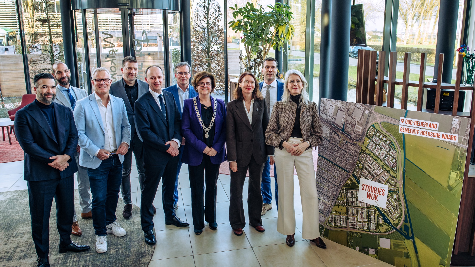 Photo caption (from left to right):Lars van Engelen (Operational Director, developer Ballast Nedam Development), Hein Verbiest (Alderman for Mobility), Dennis Lausberg (Managing Director, housing corporation HW Wonen), Marco Wijntje (Development Manager, developer Roosdom Tijhuis), Adriaan van der Wulp (Alderman for Housing), Gilbert Kokenberg (Deputy Director, developer AM Ontwikkeling), Marian Witte (Mayor of the Municipality of Hoeksche Waard), Anne Koning (Provincial Executive for Housing, Province of South Holland), Theo van der Plas (Development Manager, developer BPD Bouwfonds Gebiedsontwikkeling), Mona Keijzer (Minister for Housing and Spatial Planning).