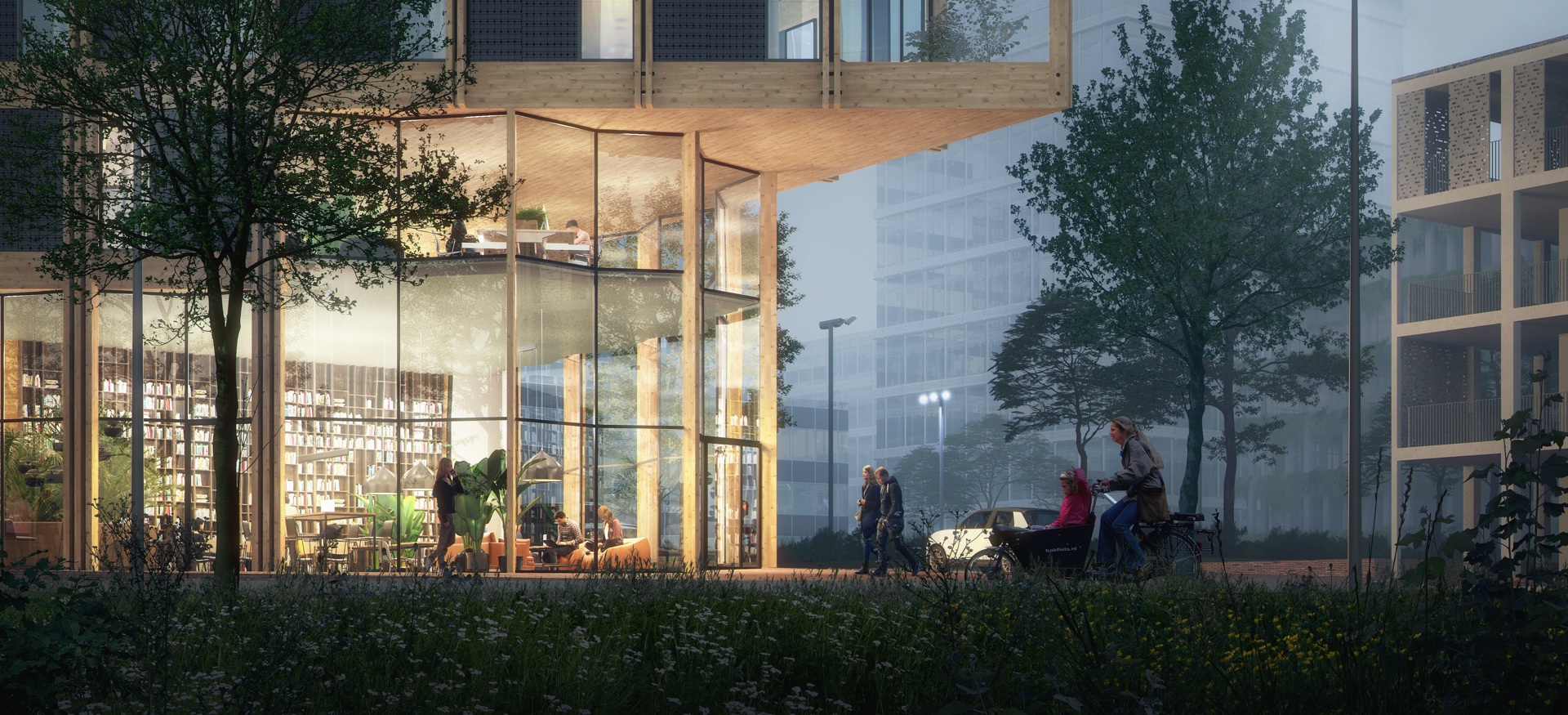 The wooden building stores more CO2 than is emitted during production, due to both the addition of biobased and recycled materials. New innovations ensure that Horizons is circular, making smart use of resources. For example, glass beads are added to the floor for extra mass, improving acoustics and maintaining the building's flexibility.