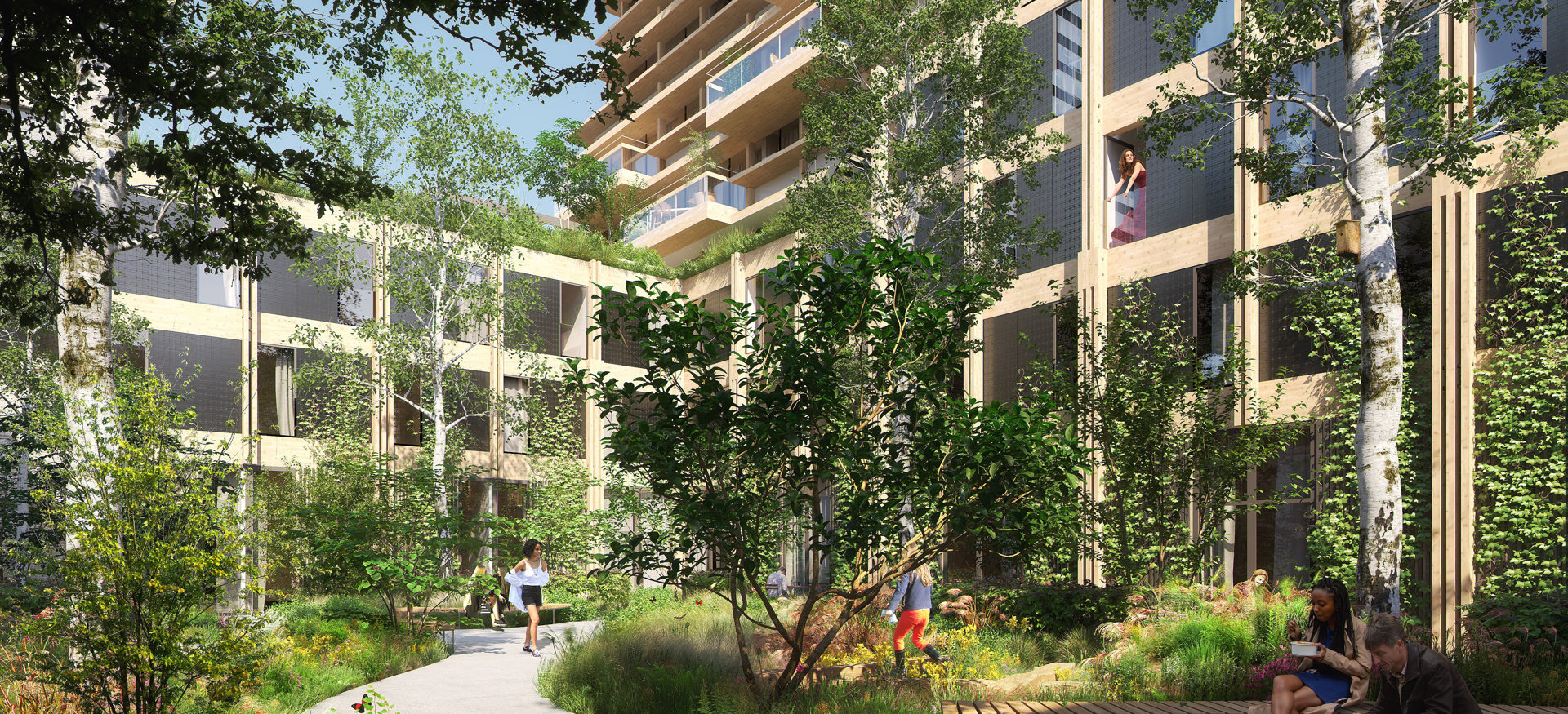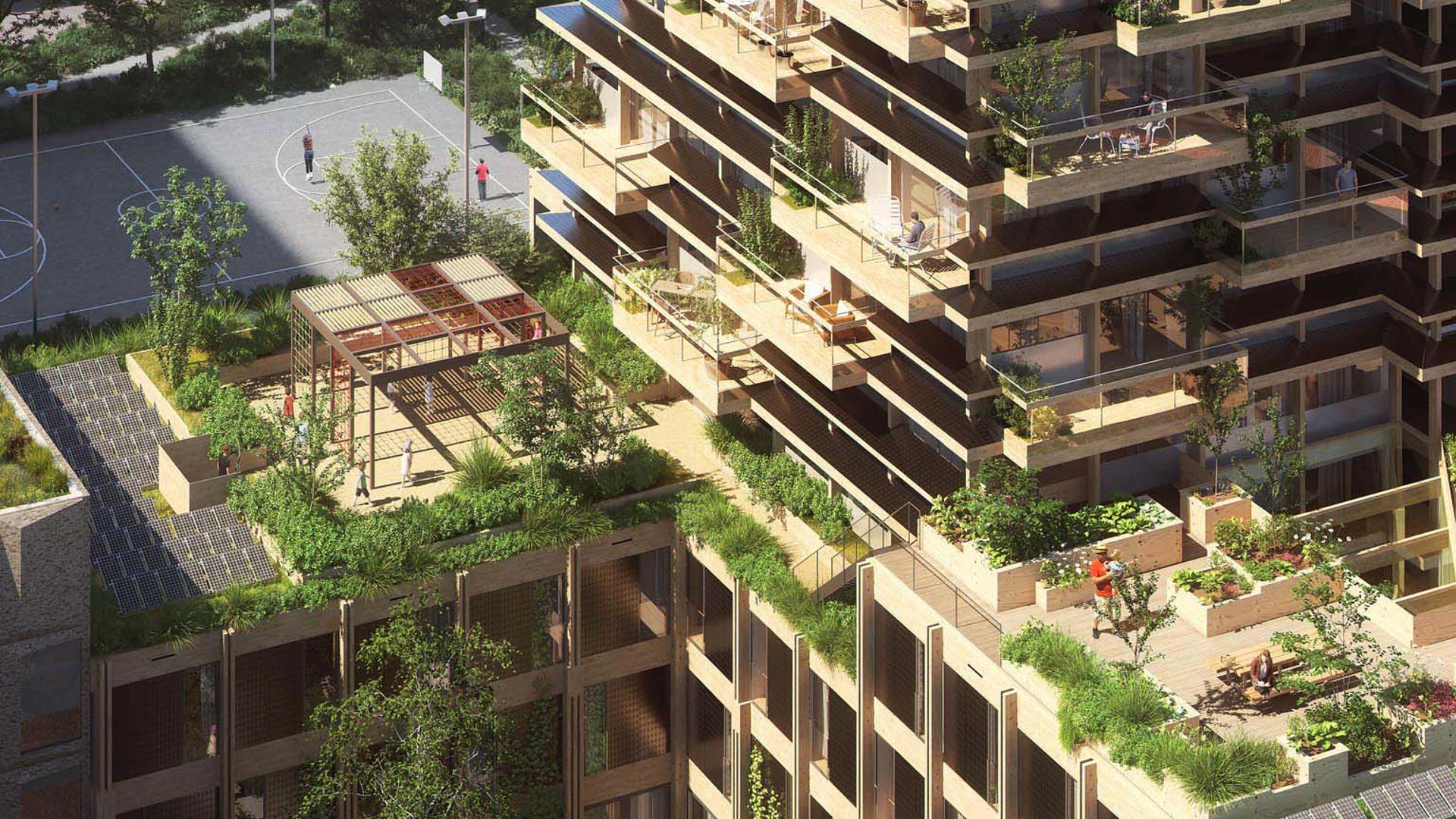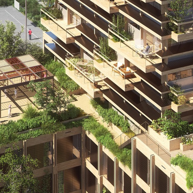 Together, people are happier, and in Horizons, residents are intentionally connected. At the heart of the building is an attractive botanical garden, a tree court with tiny forest and a communal living room. There is a strong commitment to social sustainability and designing a warm and welcoming building. Horizons' living room is an extension of everyone's home, and features shared amenities such as washing machines, library and tools in addition to workstations and places to relax. The various attractive green (rooftop) terraces, each with its own functionality, provide social connection among residents, where they can meet, garden, exercise, eat and relax.