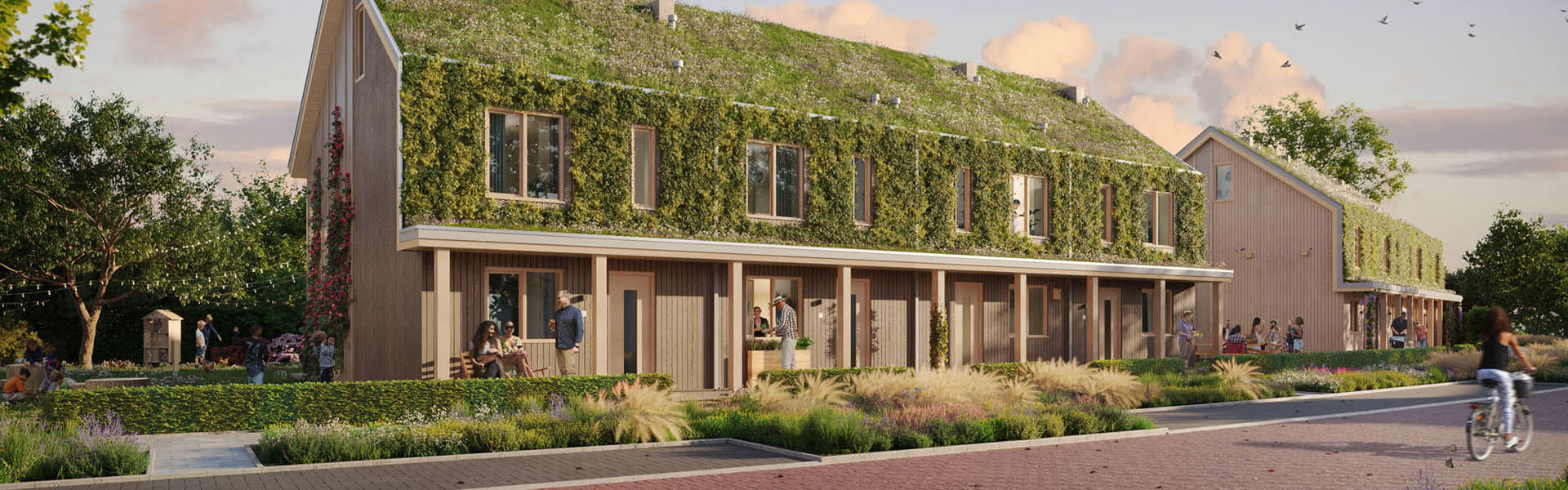The Natuurhuizen are the winning concept resulting from a search for scalable climate-positive terraced houses initiated by Ballast Nedam Development at the end of 2021. From 70 submissions, the combination of Strotec, Bouwbedrijf Van Herpen, and architecten|en|en ultimately emerged with the winning plan. These 8 houses constitute the first pilot project and thus make history with straw.